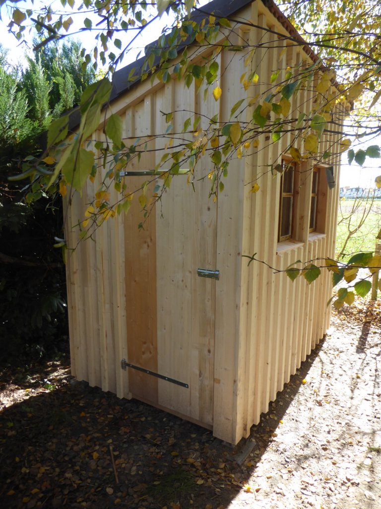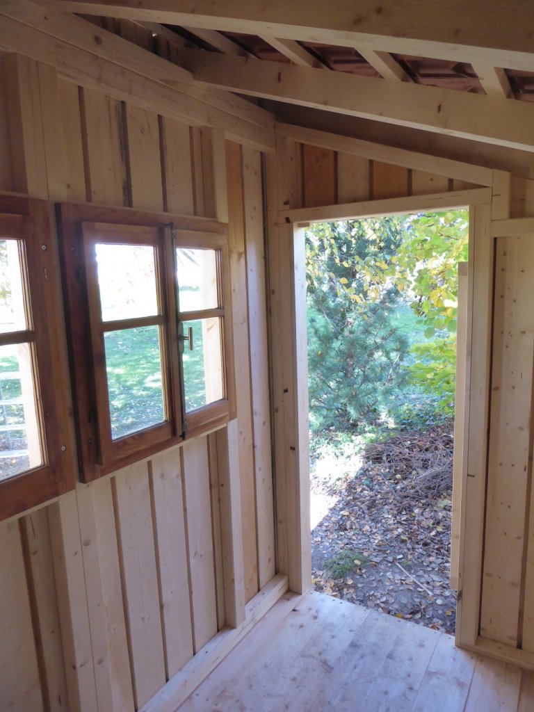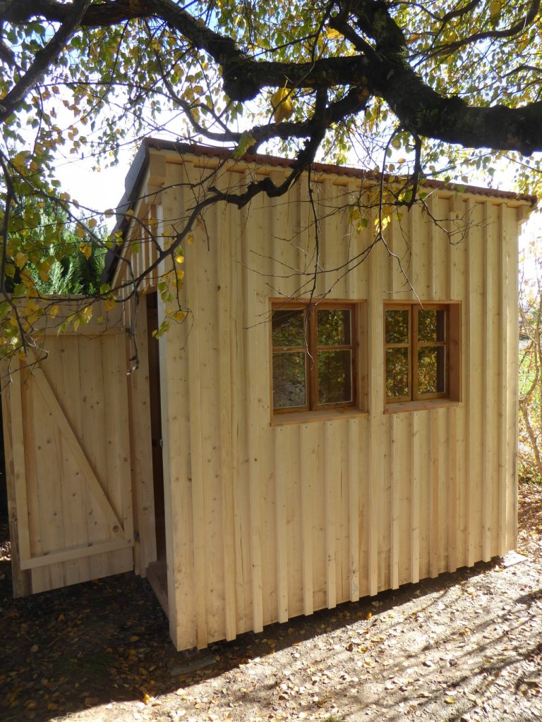 Cabanon de deux sur un mètre, socle et plancher en mélèze ou douglas, le reste en épicéa.